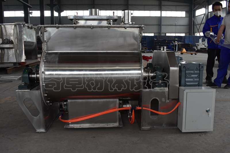 混合机设备介绍:奇卓无重力混合机由卧式筒体、传动机构、双轴搅拌桨叶组成,并可选配的破碎棒;工作时,双轴相对反向旋转带动不同角度的桨叶将物料沿轴向、径向循环翻动,在高线速度的作用下物料被抛起处于失重(即无重力)状态后落下,抛起和落下时物料交叉混合达到均匀。出料口分为大开门式和小开门式,大开门式出料快捷无残留。本机的优点是适用范围广、混合均匀度高、混合时间短。
